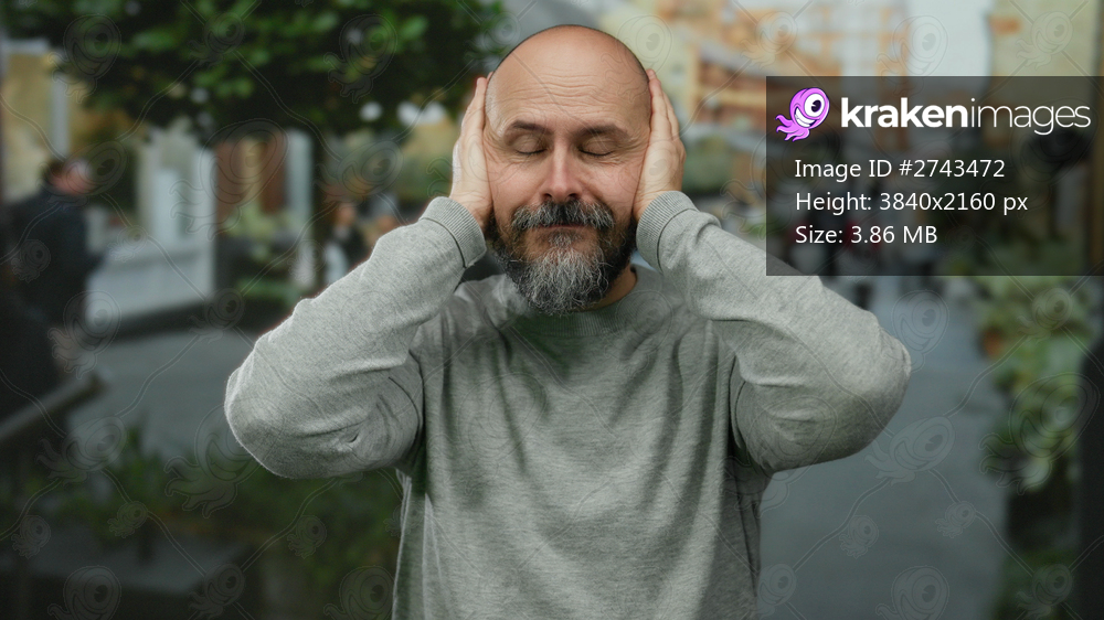 Bald man with beard covers ears in urban street setting wearing gray sweater suggesting noise or concentration in outdoor city environment.