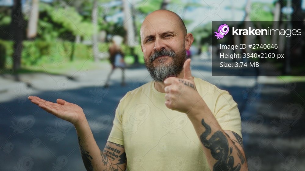 Bald man with beard gestures on city street wearing tattoos and a yellow shirt, standing under sunlight outdoors.