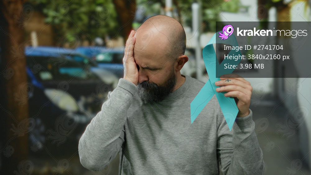 Bald man with beard holding blue cancer ribbon while standing in an urban street, expressing concern and thoughtfulness, symbolizing awareness and solidarity. - Kraken Images