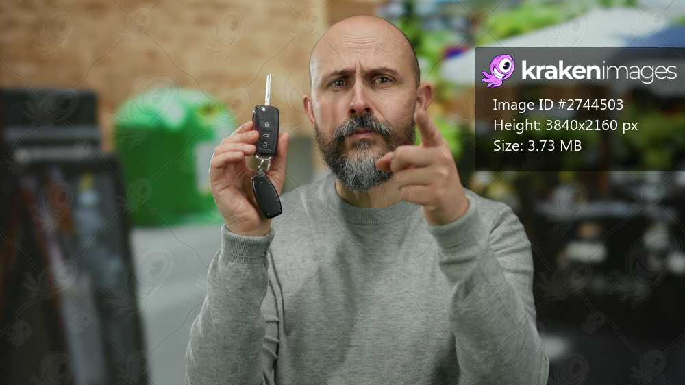 Bald man with beard holding car keys standing on urban terrace wearing gray sweater set against blurred outdoor restaurant backdrop.