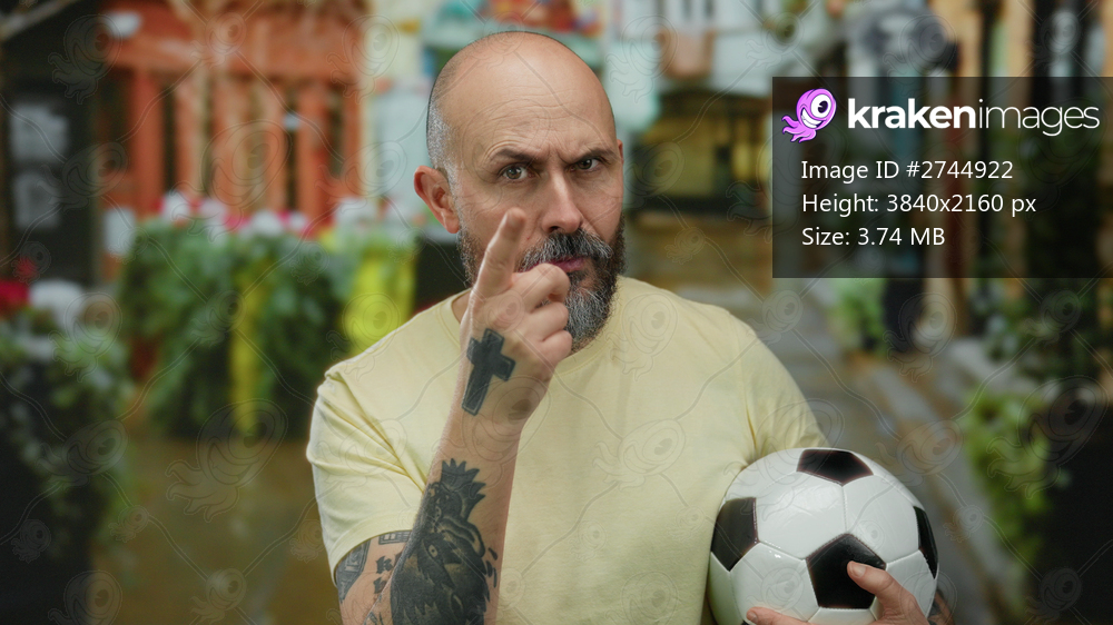 Bald man with beard holding soccer ball on urban street pointing at eye inquisitively showcasing tattoo and wearing casual yellow shirt.