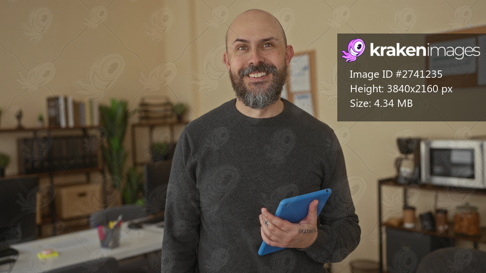 Bald man with beard holding tablet in modern office with plants and shelves, conveying a professional workplace environment and focusing on technology and business activities - Kraken Images