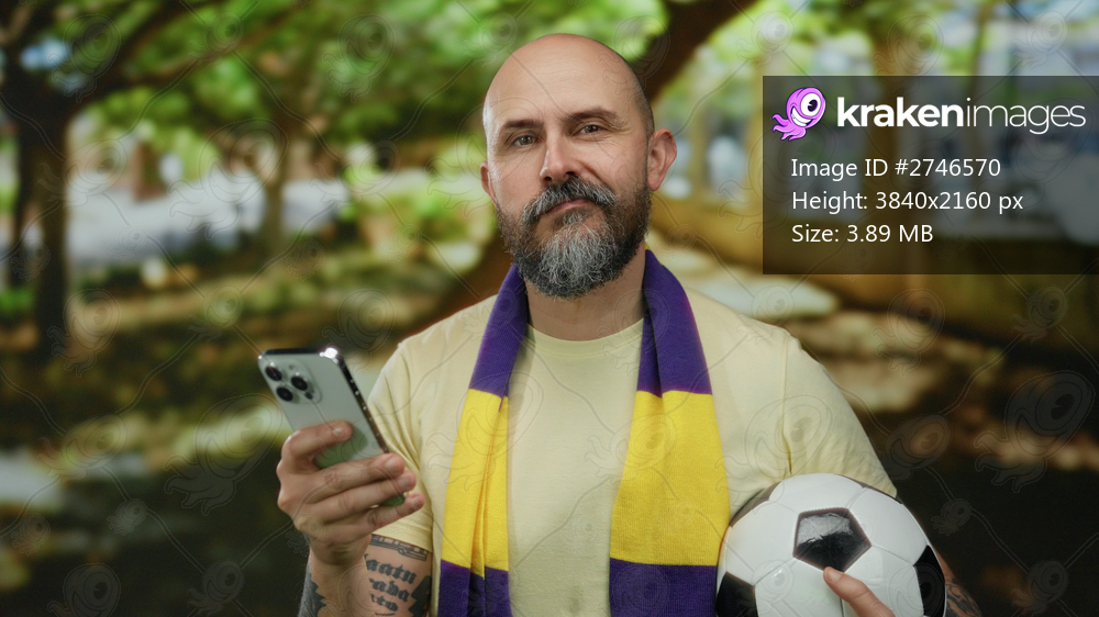 Bald man with beard holds smartphone and soccer ball, wearing yellow and purple scarf, standing in a sunny park setting.