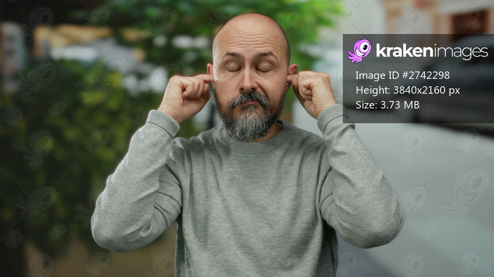Bald man with beard in gray sweater standing on an urban street, covering his ears with fingers, with blurred greenery and cars in background, expressing frustration or noise. - Kraken Images