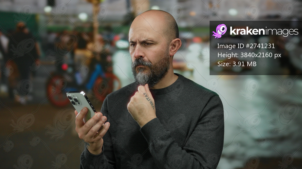 Bald man with beard intently looking at smartphone on city street at night, surrounded by urban activity and bright lights, embodying a thoughtful demeanor outdoors. - Kraken Images