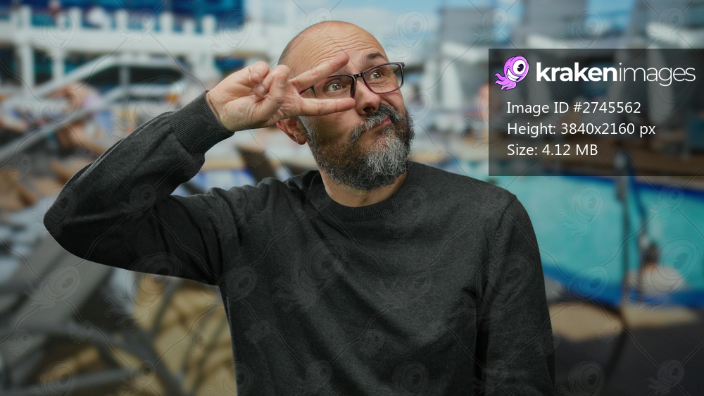 Bald man with beard making peace gesture on cruise ship deck with blurred pool in background showcasing relaxed outdoor vibe