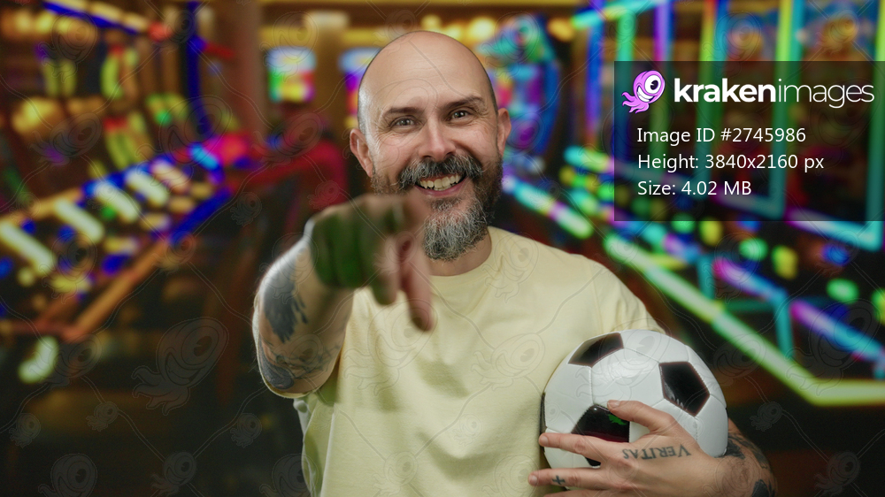Bald man with beard smiling and pointing in a casino holding a soccer ball near colorful slot machines indoor