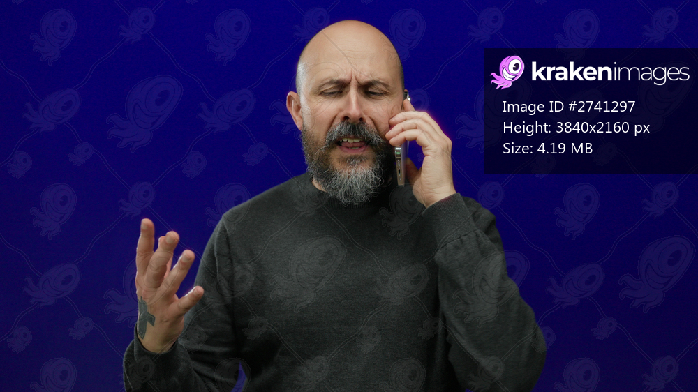 Bald man with beard talking animatedly on a cellphone against an isolated blue background wearing a dark shirt expressing concern visibly with hand gestures - Kraken Images