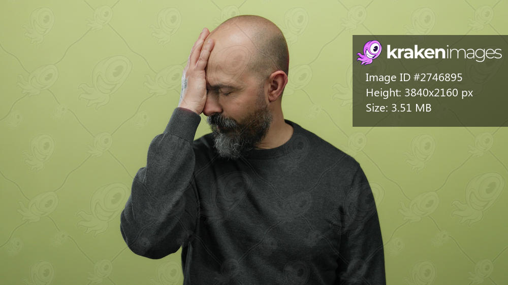 Bald man with beard and tattoo covers face on isolated yellow background conveying emotion