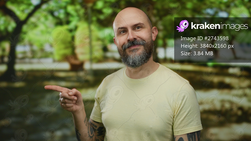 Bald man with beard and tattoos pointing outdoors in sunny park surrounded by lush green trees portraying friendliness and casual style.