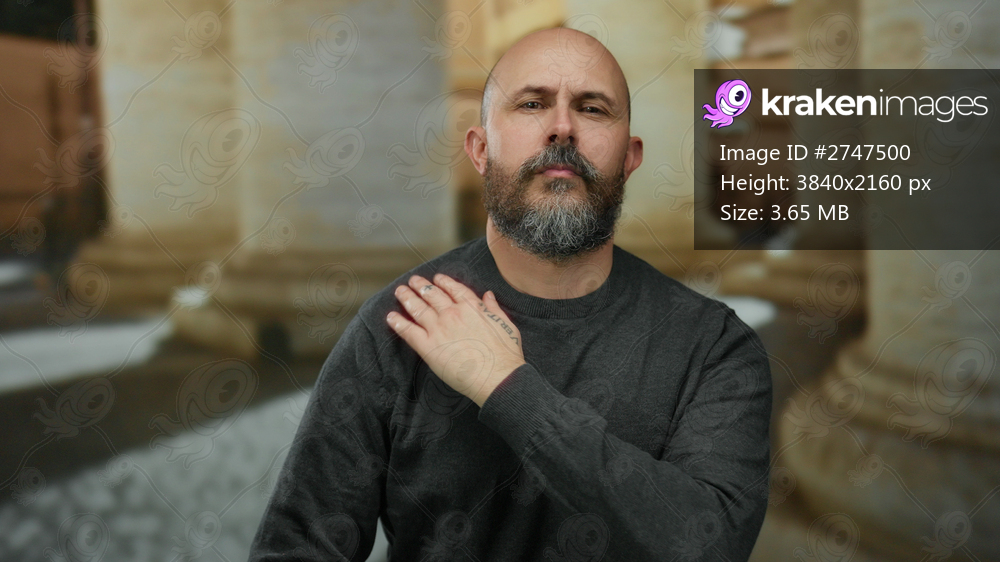 Bald man with beard and tattoos stands confidently on a city street surrounded by urban architecture and showing rustic european pillars.