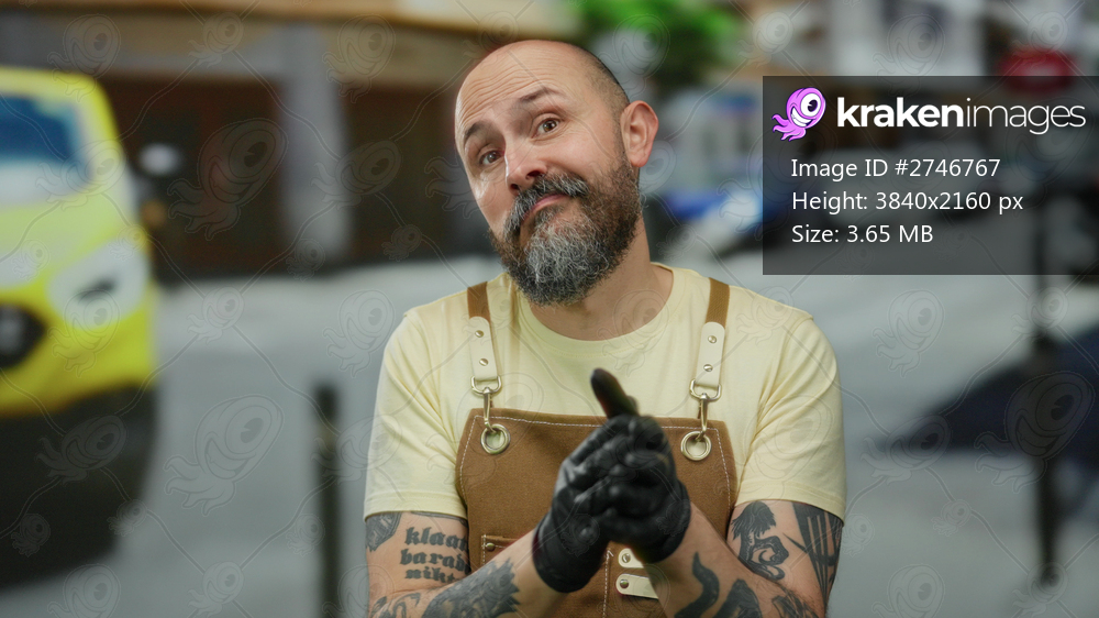 Bald man with beard and tattoos wearing gloves clapping on urban street, projecting confidence and friendliness in a casual outdoor setting.