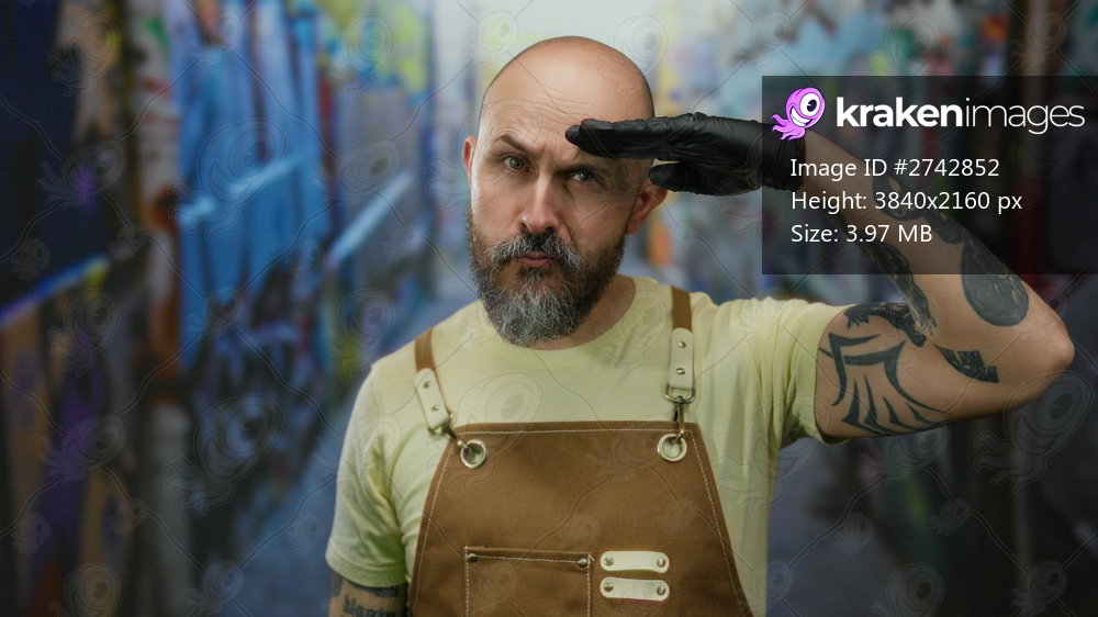 Bald man with beard wearing apron and glove is saluting in a graffiti-covered urban alley, showcasing expressive demeanor in an outdoor setting.