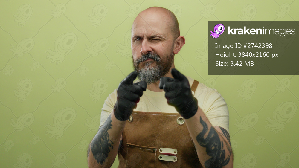 Bald man with beard winking and pointing with gloved hands against a green wall wearing a brown apron showcasing tattoos