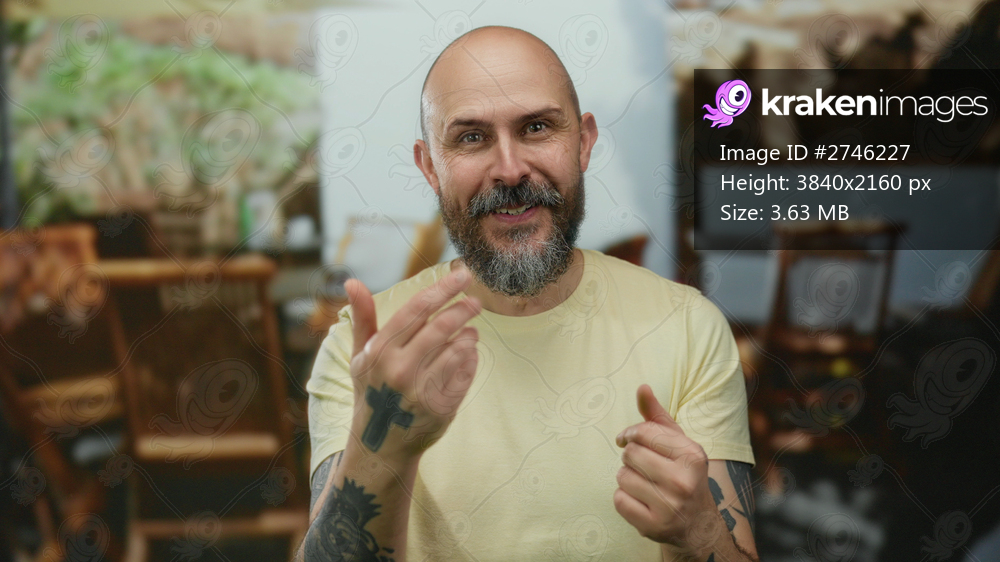 Bald man with tattoos giving thumbs up on urban terrace with blurred background suggests outdoor coffee setting in city.