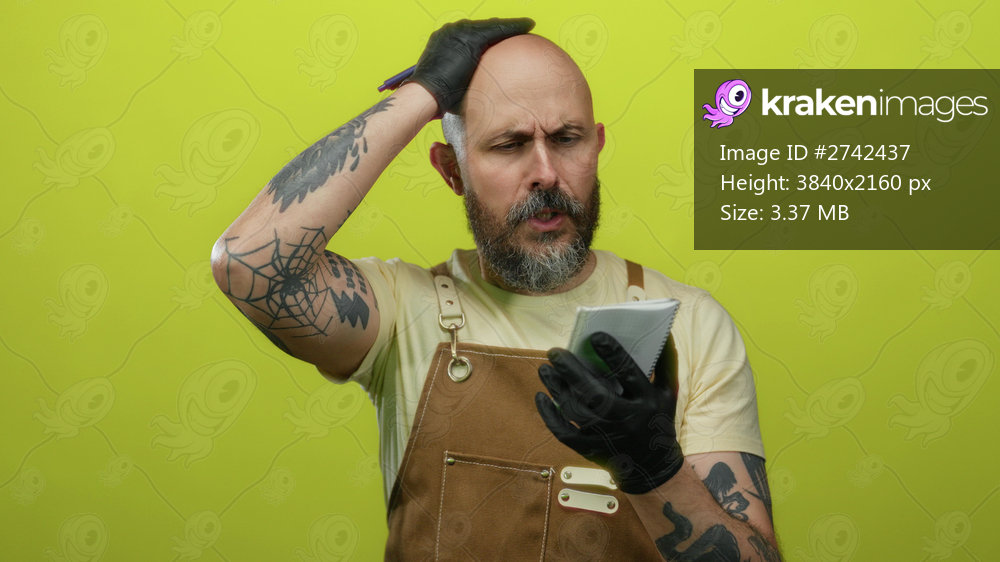 Bald man with tattoos writes notes in a small notebook on a vibrant yellow background, wearing black gloves and a beige shirt.