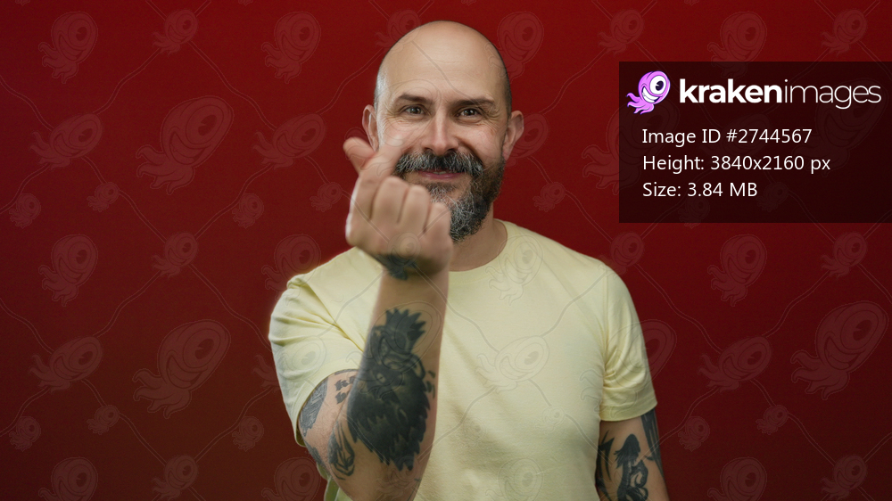 Bald, tattooed man with a beard making a heart gesture against a bright red wall, showcasing a casual, friendly expression.