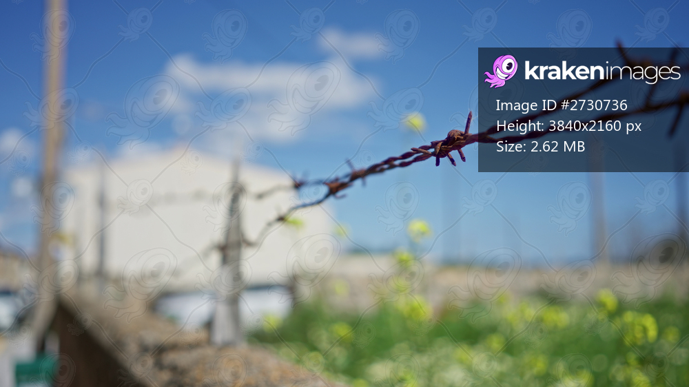 Barbed wire close up under clear blue sky with blurred countryside landscape in background