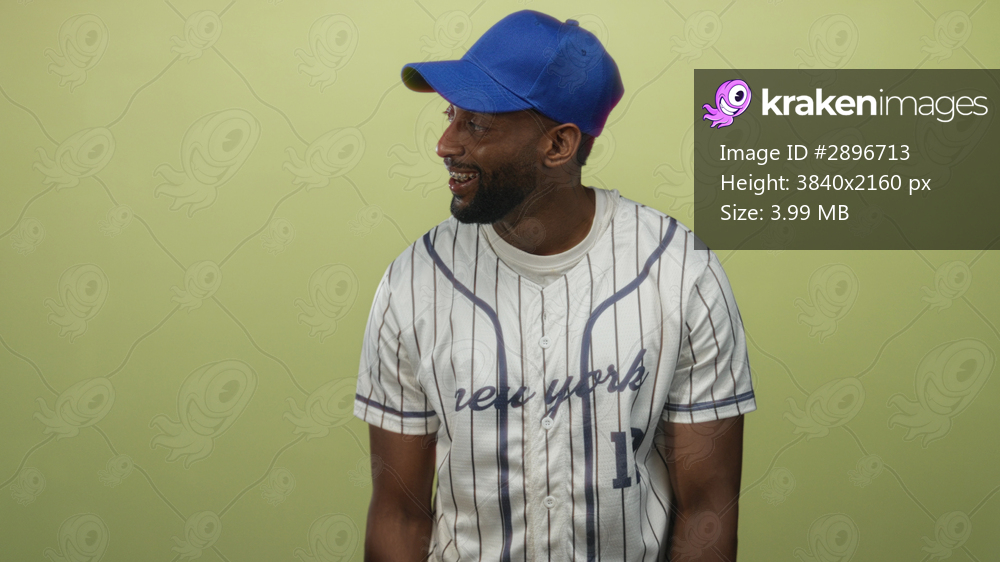 Baseball player man wearing pinstripe jersey and blue cap pointing finger to the left in studio against light green backdrop; team sport confidence.