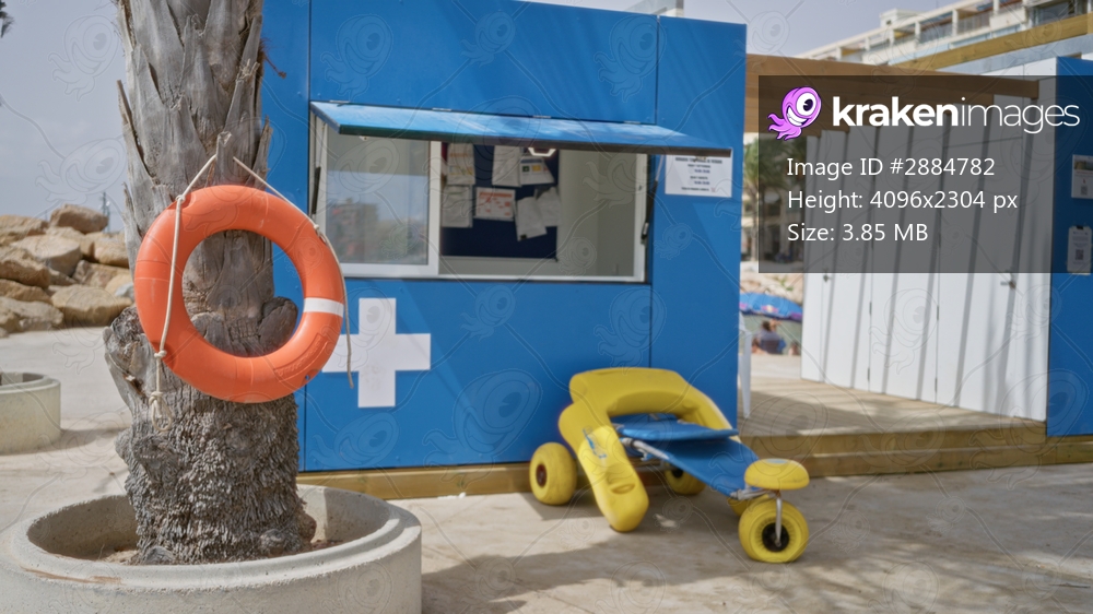 Beach kiosk with orange lifebuoy on a palm trunk and a yellow beach wheelchair, blue wall slightly blurred in soft shallow focus outdoor; background backdrop copyspace calm. - Kraken Images
