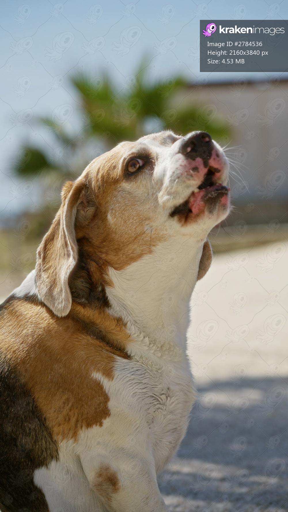 Beagle dog outdoors under sunny sky with palm tree and blurred background enjoying sunshine