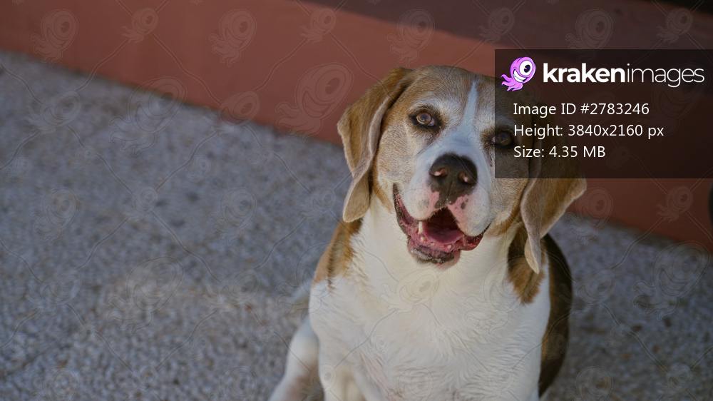 Beagle dog sitting outdoors on sunlit pavement smiling and looking up in a peaceful summer backyard setting.