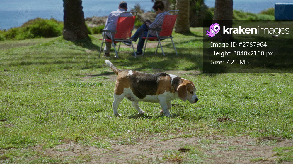 Beagle strolling on sunny grass near people relaxing outdoors by the seaside with palm trees and vibrant summer scenery.