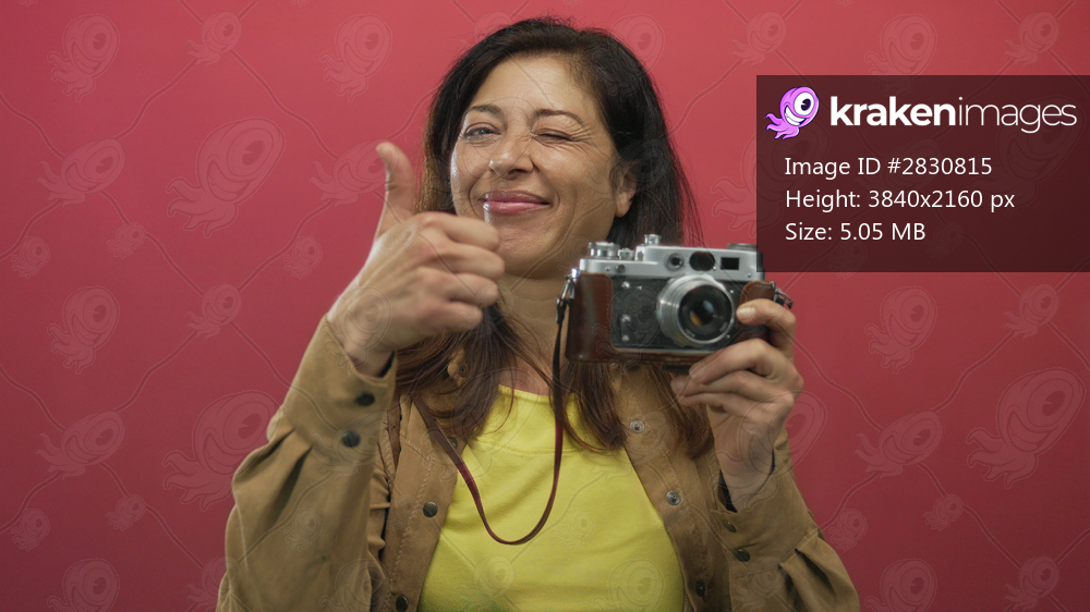 Beaming friendly hispanic woman holding vintage camera gestures thumbs up in bright pink studio; approval.