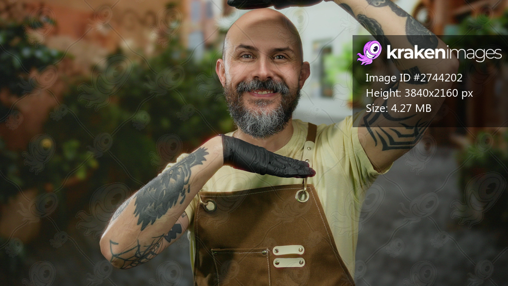 Bearded bald man in overalls with tattoos and gloves poses creatively outdoors on a quaint city street.