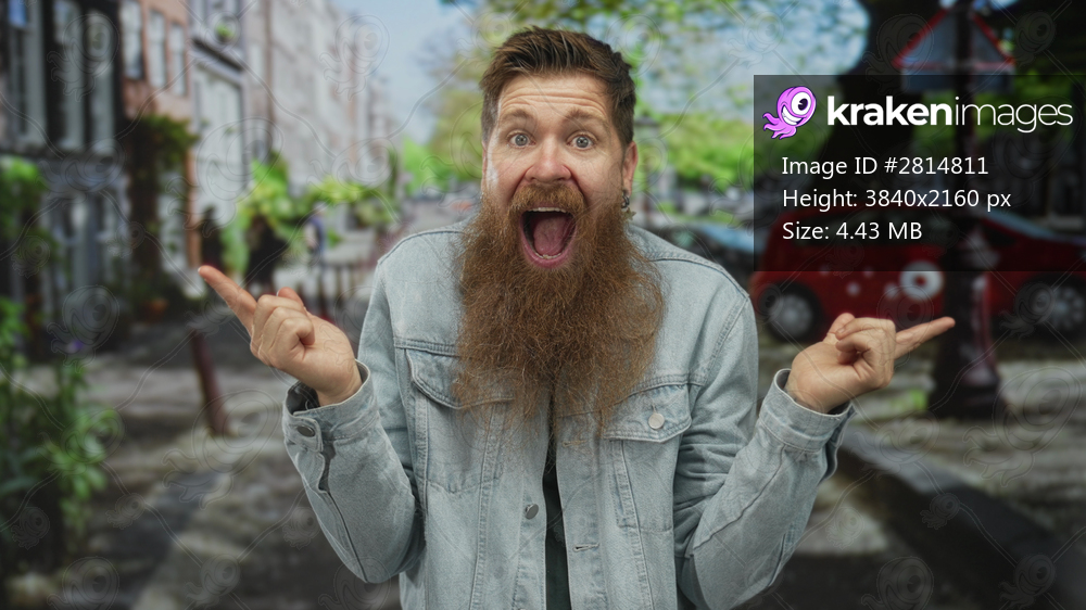 Bearded caucasian man pointing both fingers on city street in bright daylight with mouth open; excitement.