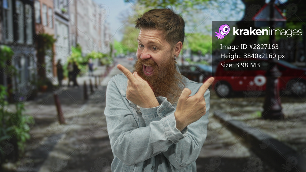 Bearded caucasian man pointing both fingers on city street in bright daylight with mouth open; excitement.