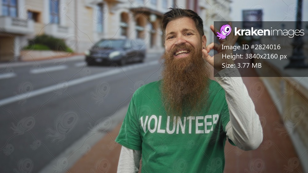 Bearded caucasian volunteer man making ok sign with hand on a busy street wearing a green volunteer shirt; approval positivity encouragement endorsement. - Kraken Images