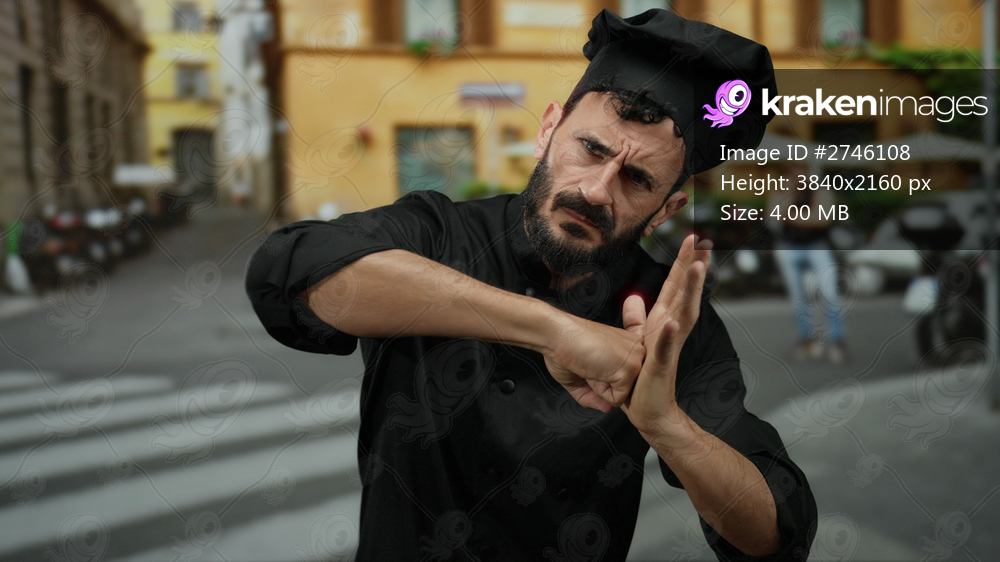Bearded hispanic man dressed as chef mimicking boxing pose on an outdoor street setting, blending professional attire with playful expression.