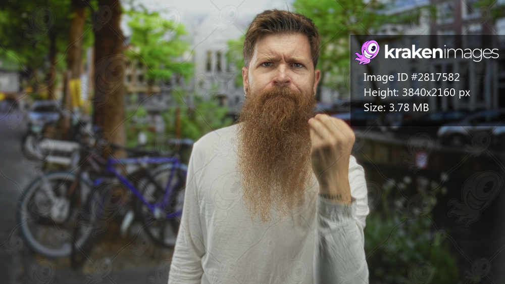Bearded man beckons finger toward camera on city street with parked bicycles and canal buildings; determination.