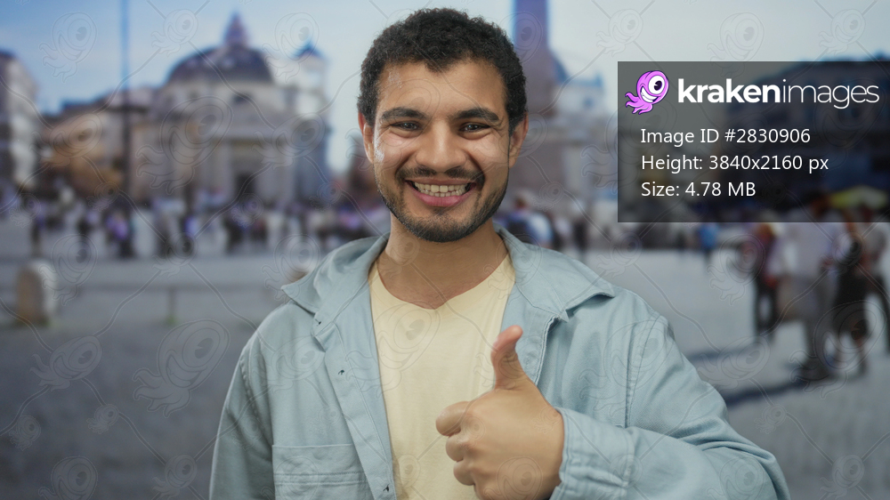 Bearded man confidently smiling gives thumbs up at vatican building; travel cultural inspiration joy.