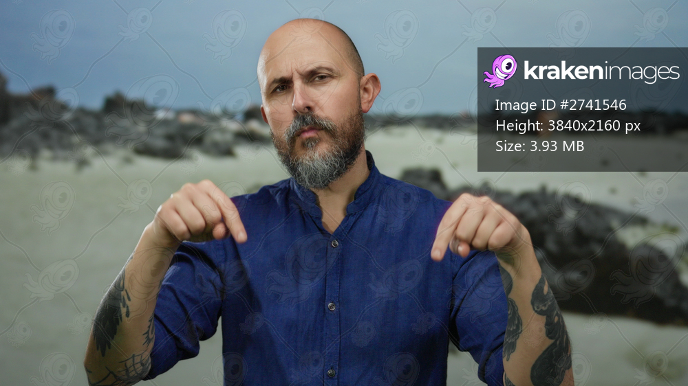 Bearded man gesturing confidently on a rocky beach while wearing a blue shirt under a cloudy sky showcasing a rugged seaside environment.