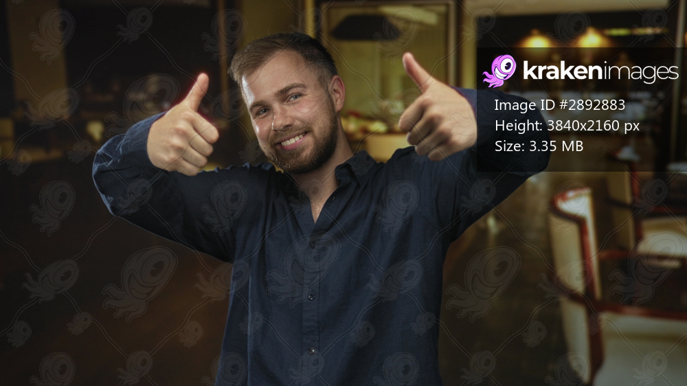 Bearded man giving two thumbs up inside a restaurant building, smiling broadly while seated among chairs; casual confidence.