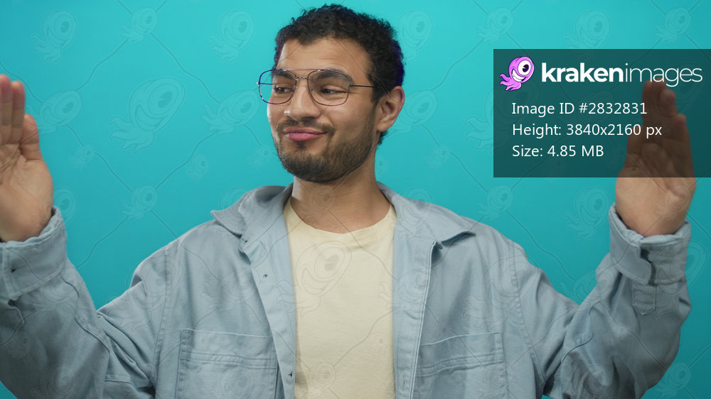 Bearded man with glasses holds up hands against turquoise wall in studio wearing a light shirt; optimism.