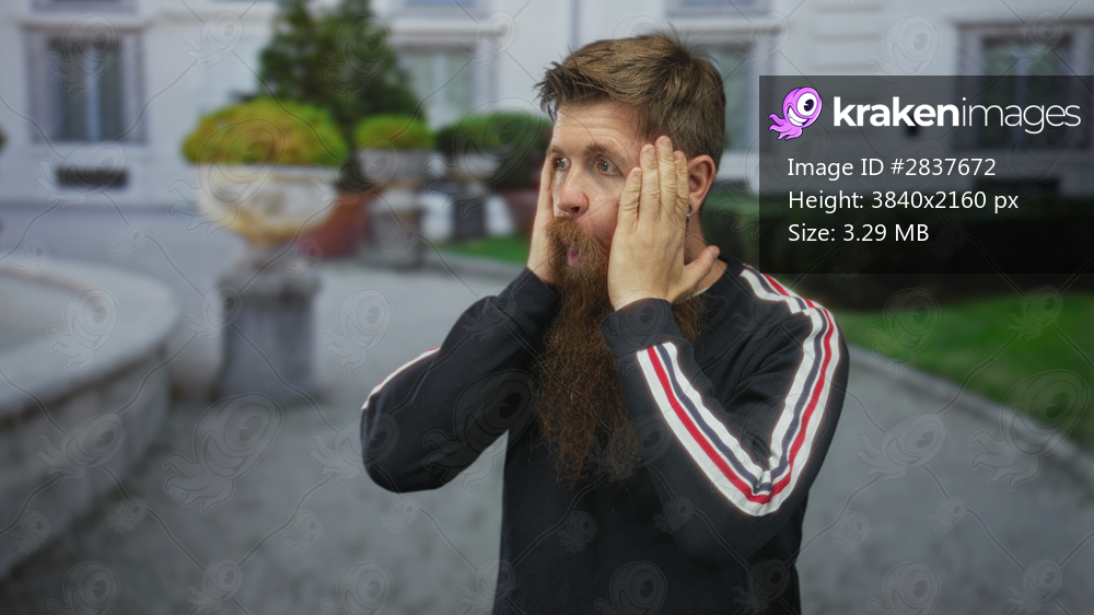 Bearded man holding cheeks with both hands on city street near fountain outdoors during daytime; surprise shock astonishment.