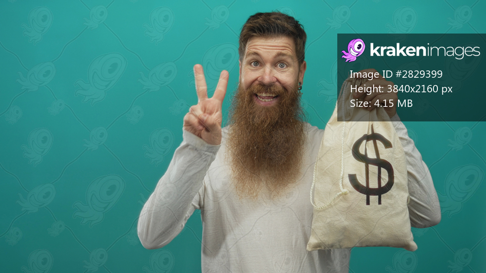 Bearded man holding large money bag and making peace sign in teal studio; wealth triumph celebration excitement.