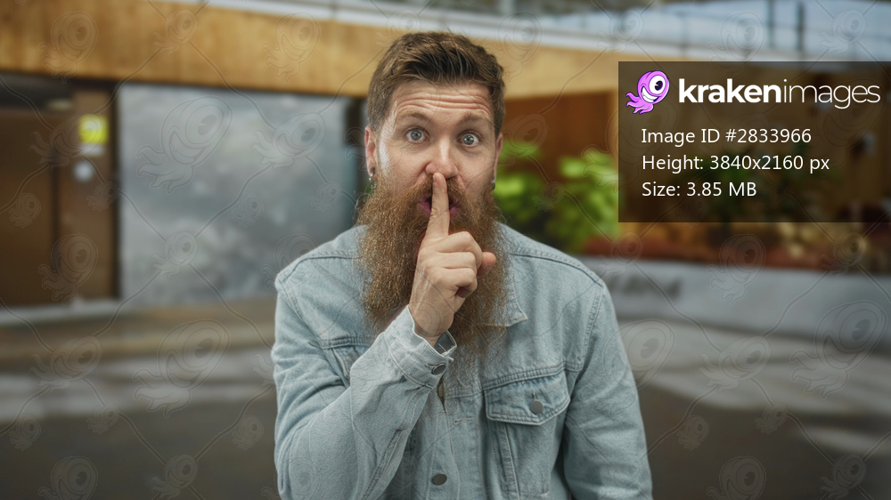 Bearded man holds finger to lips for silence at building entrance in urban outdoor setting; quiet secrecy.