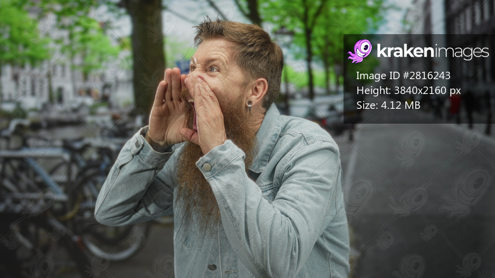 Bearded man holds hand in phone gesture to ear on a busy city street next to rental bike racks wearing denim jacket; excitement.