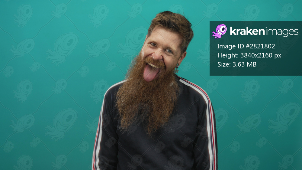 Bearded man in black sweatshirt with stripe sleeves sticks tongue out against a teal studio wall; playful humor.