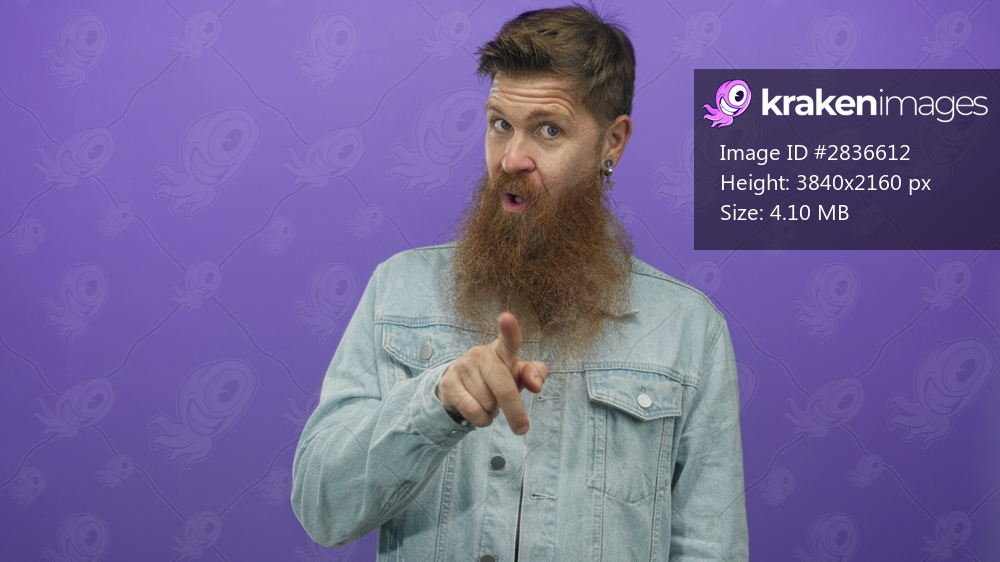 Bearded man in denim jacket with long ginger beard and open mouth expression pressing hand to chest in purple studio; surprise.