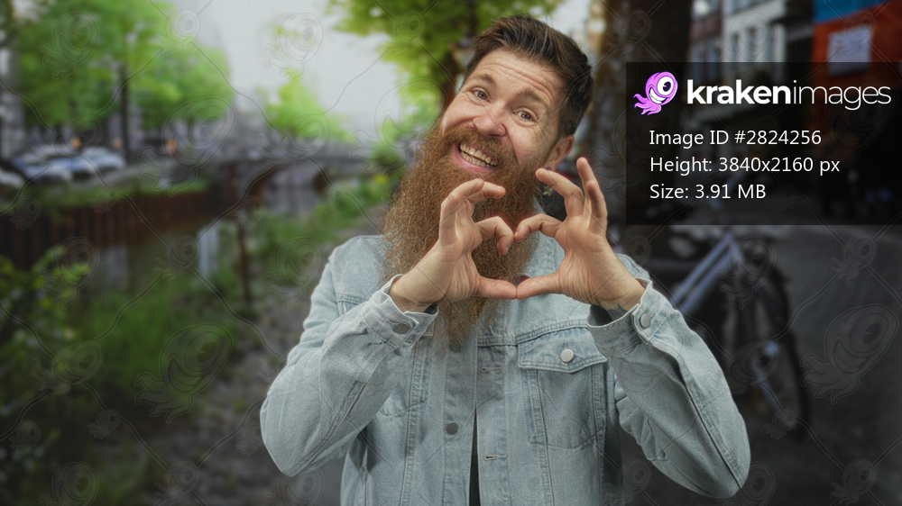 Bearded man in denim jacket makes heart shape with hands on street beside bicycle while smiling; affection warmth connection love.
