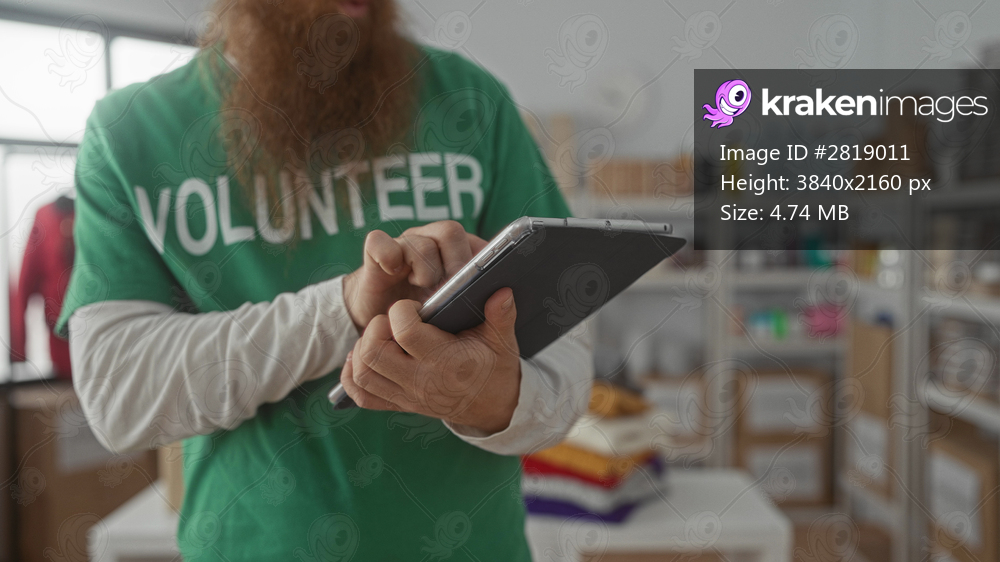 Bearded man in green volunteer shirt taps tablet with fingers inside a sunlit building lined with donation shelves and stacked boxes; compassion.