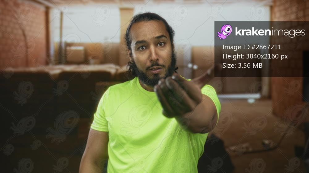 Bearded man in neon green shirt reaching hand toward camera inside building site with stacked boxes and brick walls; urgent appeal.