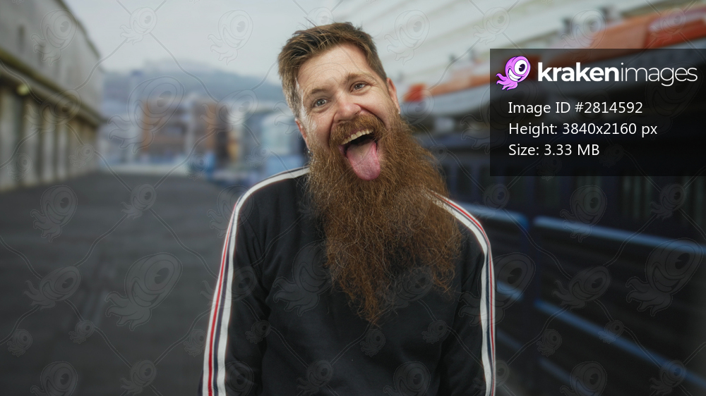 Bearded man leans on railing by lifeboat and winks eye and sticks tongue out on cruise ship deck; lighthearted fun.