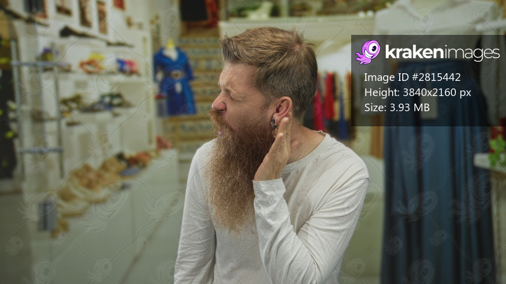 Bearded man with long beard and casual white shirt pressing hand to ear in building clothing store aisle; vulnerability discomfort.