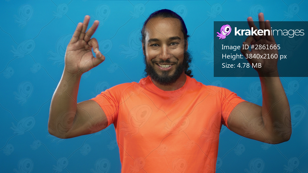 Bearded man making ok hand sign with bare hand visible, wearing bright orange t shirt in blue studio; confidence approval.